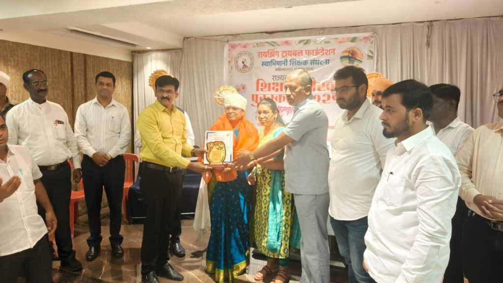 रायझिंग ट्रायबल फाउंडेशन महाराष्ट्र राज्य स्वाभिमानी शिक्षक संघटना अहिल्यानगर यांच्या वतीने दिला जाणारा राज्यस्तरीय शिक्षक गौरव पुरस्कार 2025 यावर्षी विनायक विद्या मंदिर पारनेर शाळेतील मुख्याध्यापिका शोभना बबनराव बांदल यांना मान्यवरांच्या हस्ते पुरस्कार प्रदान करण्यात आला. यावेळी माजी शिक्षण संचालक, प्राथमिक शिक्षण दिनकर टेमकर,सहसंचालक प्राथमिक शिक्षण संचालक रमाकांत काठमोरे ,मनपा शिक्षण विभाग अधिकारी जुबेर पठाण, संस्थापक अध्यक्ष स्वाभिमानी शिक्षक संघटना के पी पाटील, जिल्हा अध्यक्ष स्वाभिमानी शिक्षक संघटना प्रसाद शिंदे सर, तालुकाध्यक्ष प्रवीण साळवे सर आदी मान्यवर उपस्थित होते.