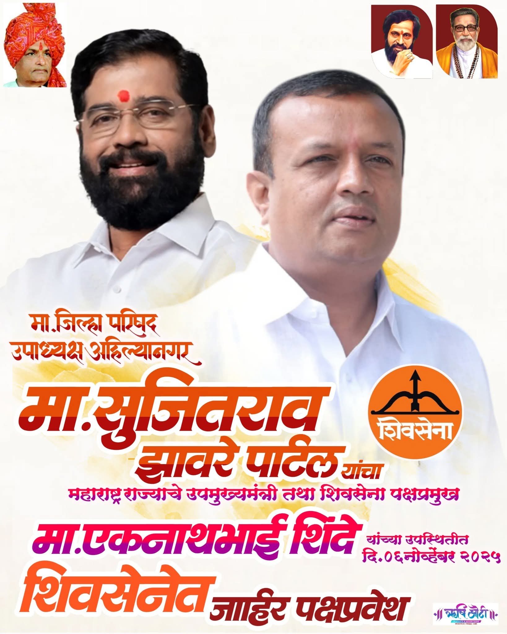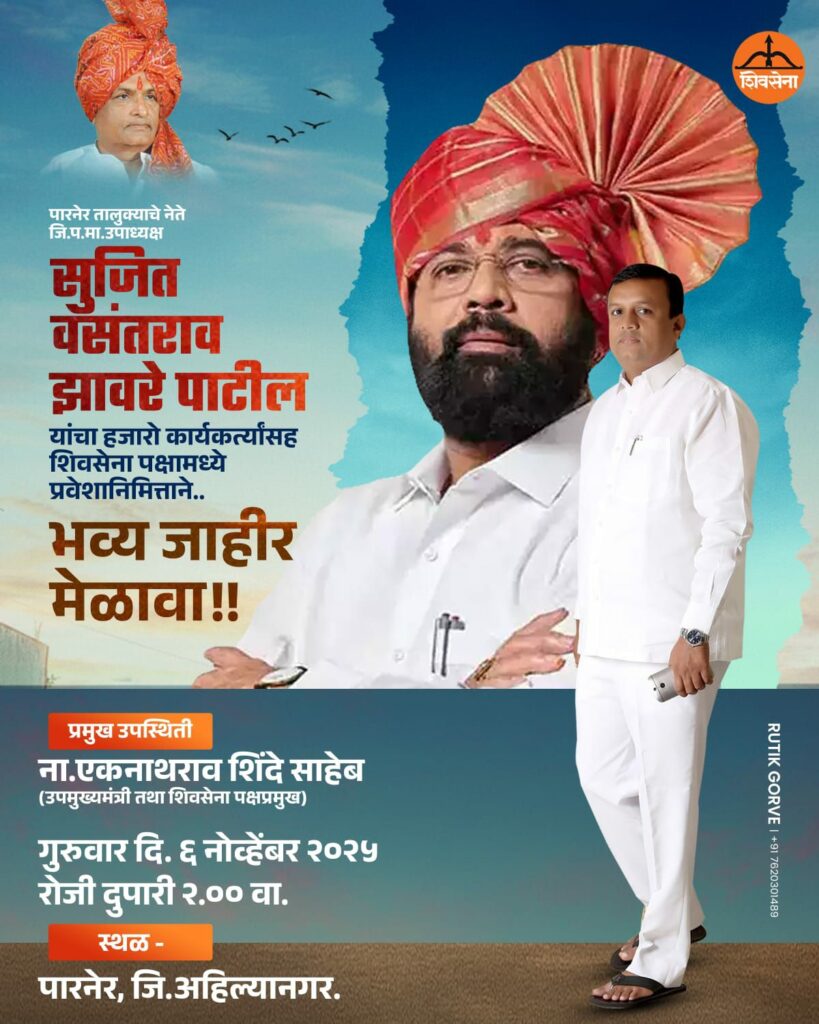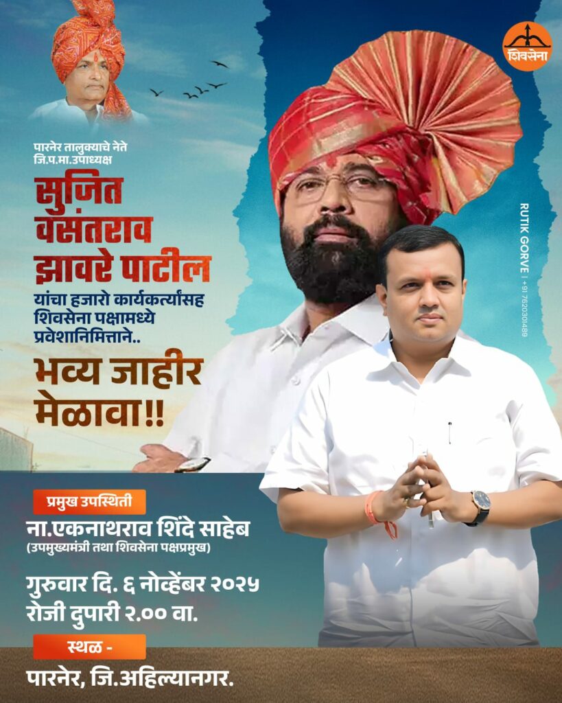 पारनेर तालुक्यातील राजकीय वातावरण ढवळून निघाले आहे. सुजित झावरे पाटील यांनी शिवसेना (एकनाथ शिंदे गट) मध्ये प्रवेश करण्याचा निर्णय घेतला असून, हा भव्य सोहळा ६ नोव्हेंबर रोजी पारनेर येथे आयोजित करण्यात आला आहे. या कार्यक्रमाला स्वतः उपमुख्यमंत्री एकनाथ शिंदे उपस्थित राहणार असून, त्यांच्या उपस्थितीत झावरे पाटील यांचा पक्षप्रवेश होणार आहे. या घटनेमुळे तालुक्यातील राजकीय समीकरणे बदलण्याची शक्यता वर्तवली जात आहे.