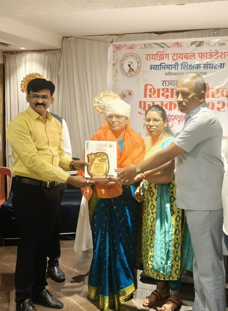 रायझिंग ट्रायबल फाउंडेशन महाराष्ट्र राज्य स्वाभिमानी शिक्षक संघटना अहिल्यानगर यांच्या वतीने दिला जाणारा राज्यस्तरीय शिक्षक गौरव पुरस्कार 2025 यावर्षी विनायक विद्या मंदिर पारनेर शाळेतील मुख्याध्यापिका शोभना बबनराव बांदल यांना मान्यवरांच्या हस्ते पुरस्कार प्रदान करण्यात आला. यावेळी माजी शिक्षण संचालक, प्राथमिक शिक्षण दिनकर टेमकर,सहसंचालक प्राथमिक शिक्षण संचालक रमाकांत काठमोरे ,मनपा शिक्षण विभाग अधिकारी जुबेर पठाण, संस्थापक अध्यक्ष स्वाभिमानी शिक्षक संघटना के पी पाटील, जिल्हा अध्यक्ष स्वाभिमानी शिक्षक संघटना प्रसाद शिंदे सर, तालुकाध्यक्ष प्रवीण साळवे सर आदी मान्यवर उपस्थित होते.